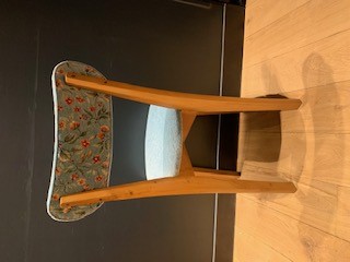 Une petite nouvelle qui repart pour une longue vie. Structure poncée puis vernie en chêne clair. La garniture a entièrement été refaite en mousse et recouverte d’un velours vert d’eau pour l’assise et d’un velours à fleurs sur fond vert d’eau pour le dossier.
