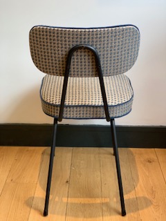 Chaise sauterelle entièrement rénovée. La structure, rouillée, a été décapée puis repeinte en noir. Assise ressorts et mousse. Cette chaise a été tapissée d’un tissu pied-de-poule couleur lin et bleu gris. Passepoil en velours bleu gris.