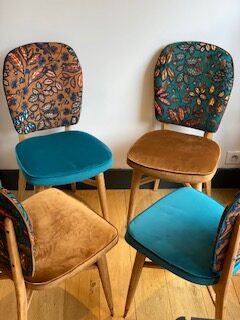 Chaises entièrement restaurées. Garniture ressorts et mousse. Elles ont été recouvertes d’un très beau velours fleuri pour le dossier et d’un velours uni pour l’assise.