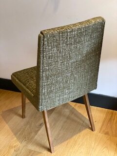 Premier d’une paire de fauteuils vintage. Entièrement restauré en mousse, il a ensuite été tapissé d’un velours chiné vert passé pour accentuer son style vintage.